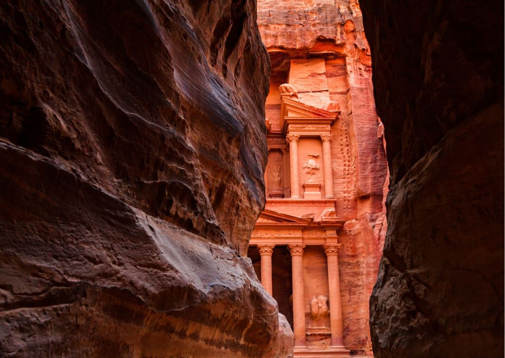 Petra “Una città rosata vecchia la metà del tempo” Le gigantesche montagne rosse e i vasti mausolei di una razza defunta non hanno nulla in comune con la civiltà moderna e non le chiedono nulla se non di essere apprezzate nel loro vero valore – come una delle più grandi meraviglie mai realizzate dalla natura e dall’uomo. Sebbene sia stato scritto molto su Petra, nulla ti prepara davvero per questo posto fantastico. Bisogna vedere per crederci. Petra, la meraviglia del mondo, è senza dubbio il tesoro più prezioso della Giordania e la più grande attrazione turistica. È una città vasta e unica, scavata nella roccia a picco dai Nabatei, un popolo arabo industrioso che si stabilì qui più di 2000 anni fa, trasformandola in un importante snodo per la seta, le spezie e altre rotte commerciali che collegavano la Cina, India e Arabia meridionale con Egitto, Siria, Grecia e Roma. L’ingresso alla città avviene attraverso il Siq, una stretta gola, lunga oltre 1 km, che è fiancheggiata su entrambi i lati da svettanti scogliere alte 80 m. Anche solo camminare attraverso il Siq è un’esperienza in sé. I colori e le formazioni delle rocce sono abbaglianti. Quando raggiungi la fine del Siq, vedrai per la prima volta Al-Khazneh (Tesoro).