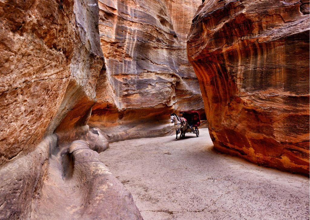 Ci sono obelischi, templi, altari sacrificali e strade colonnate, e in alto, con vista sulla valle, c’è l’imponente Monastero di Ad-Deir: una scalinata di 800 gradini scavati nella roccia ti porta lì. All’interno del sito ci sono anche 2 eccellenti musei: il Museo Archeologico di Petra e il Museo Nabateo di Petra, entrambi i quali rappresentano reperti provenienti dagli scavi nella regione di Petra e uno spaccato del colorato passato di Petra. Un santuario del XIII secolo, costruito dal sultano mamelucco, Al Nasir Mohammad, per commemorare la morte di Aronne, fratello di Mosè, può essere visto in cima al monte Aronne nella catena della Sharah. All’interno del sito, diversi artigiani della città di Wadi Musa e di un vicino insediamento beduino hanno allestito piccole bancarelle che vendono artigianato locale, come ceramiche e gioielli beduini, e bottiglie di sabbie multicolori striate della zona. Non è consentito l’ingresso di veicoli a motore nel sito. Ma se non vuoi camminare, puoi noleggiare un cavallo o una carrozza trainata da cavalli per portarti attraverso il Siq di un chilometro. Per gli anziani e/o portatori di handicap, il Centro Visitatori, vicino all’ingresso del Siq, rilascerà un permesso speciale (a pagamento), per l’ingresso in carrozza all’interno di Petra per visitare le principali attrazioni. Una volta all’interno del sito, puoi noleggiare un asino o, per i più avventurosi, un cammello: entrambi sono dotati di gestori e percorrono percorsi designati in tutto il sito.