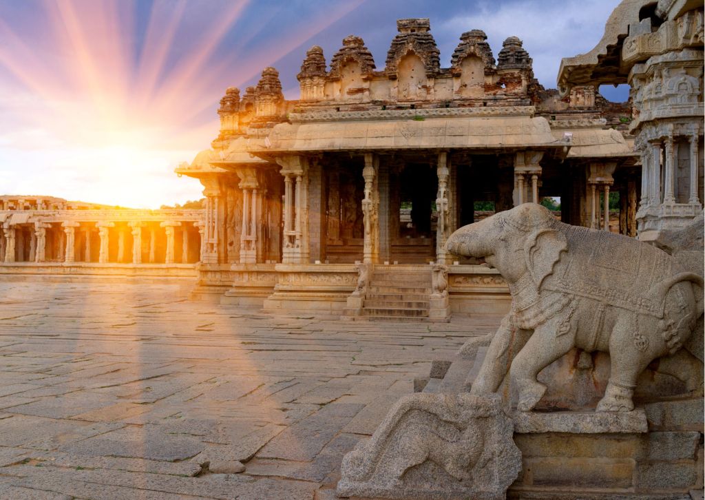 il potente impero di Vijayanagar fu fondato nel 1336 da due fratelli: Harihara e Bukka. Sebbene i Moghul fossero i potenti sovrani predominanti a quei tempi e stessero rafforzando la loro presenza in quasi tutto il subcontinente, trovarono l’impero Vijayanagar del sud troppo difficile da abbattere. Durante il regno di Krishnadevaraya, dal 1509 al 1529, il regno di Vijayanagar prosperò sia economicamente che culturalmente. Coprendo un’area di circa 26 km, le rovine sono situate nel mezzo di un paesaggio aspro. Hampi è come un museo all’aperto di templi, il Tempio Virupaksha si erge maestoso, all’estremità occidentale di una strada lunga 700 m, che un tempo era occupata dal famoso bazar di Hampi. Nelle vicinanze si trova il monolite alto 6,7 m di Ugra Narasimha o Lakshmi Narasimha, si trova a Sud del gruppo di templi Hemakuta che comprende il Tempio di Virupaksha. Il Narasimha è una figura a quattro braccia seduta sotto il baldacchino con un serpente a sette teste. Ma di gran lunga il monumento più sorprendente di Hampi, è il complesso del tempio di Vittala, con i suoi 56 pilastri musicali. La leggenda narra che Lord Vishnu lo trovò troppo grandioso per viverci e quindi tornò alla sua “umile casa”. A est del complesso si trova il famoso carro di pietra, con ruote di pietra.