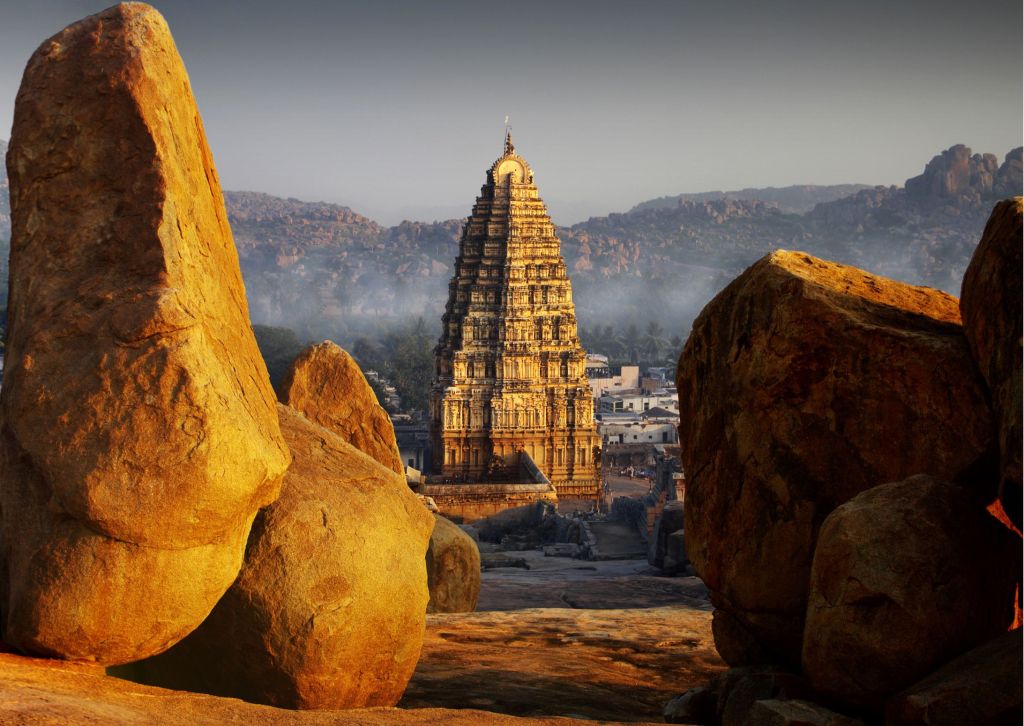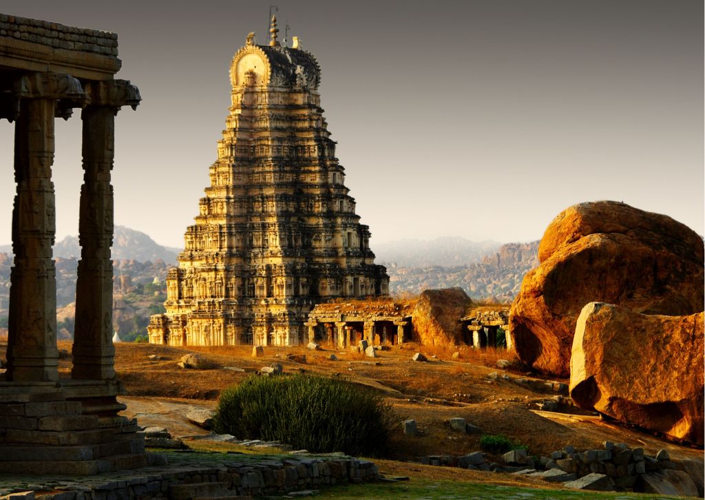 Il potente impero di Vijayanagar fu fondato nel 1336 da due fratelli: Harihara e Bukka. Sebbene i Moghul fossero i potenti sovrani predominanti a quei tempi e stessero rafforzando la loro presenza in quasi tutto il subcontinente, trovarono l’impero Vijayanagar del sud troppo difficile da abbattere. Durante il regno di Krishnadevaraya, dal 1509 al 1529, il regno di Vijayanagar prosperò sia economicamente che culturalmente. Coprendo un’area di circa 26 km, le rovine sono situate nel mezzo di un paesaggio aspro. Hampi è come un museo all’aperto di templi, il Tempio Virupaksha si erge maestoso, all’estremità occidentale di una strada lunga 700 m, che un tempo era occupata dal famoso bazar di Hampi. Nelle vicinanze si trova il monolite alto 6,7 m di Ugra Narasimha o Lakshmi Narasimha, si trova a Sud del gruppo di templi Hemakuta che comprende il Tempio di Virupaksha. Il Narasimha è una figura a quattro braccia seduta sotto il baldacchino con un serpente a sette teste. Ma di gran lunga il monumento più sorprendente di Hampi, è il complesso del tempio di Vittala, con i suoi 56 pilastri musicali. La leggenda narra che Lord Vishnu lo trovò troppo grandioso per viverci e quindi tornò alla sua “umile casa”. A est del complesso si trova il famoso carro di pietra, con ruote di pietra.