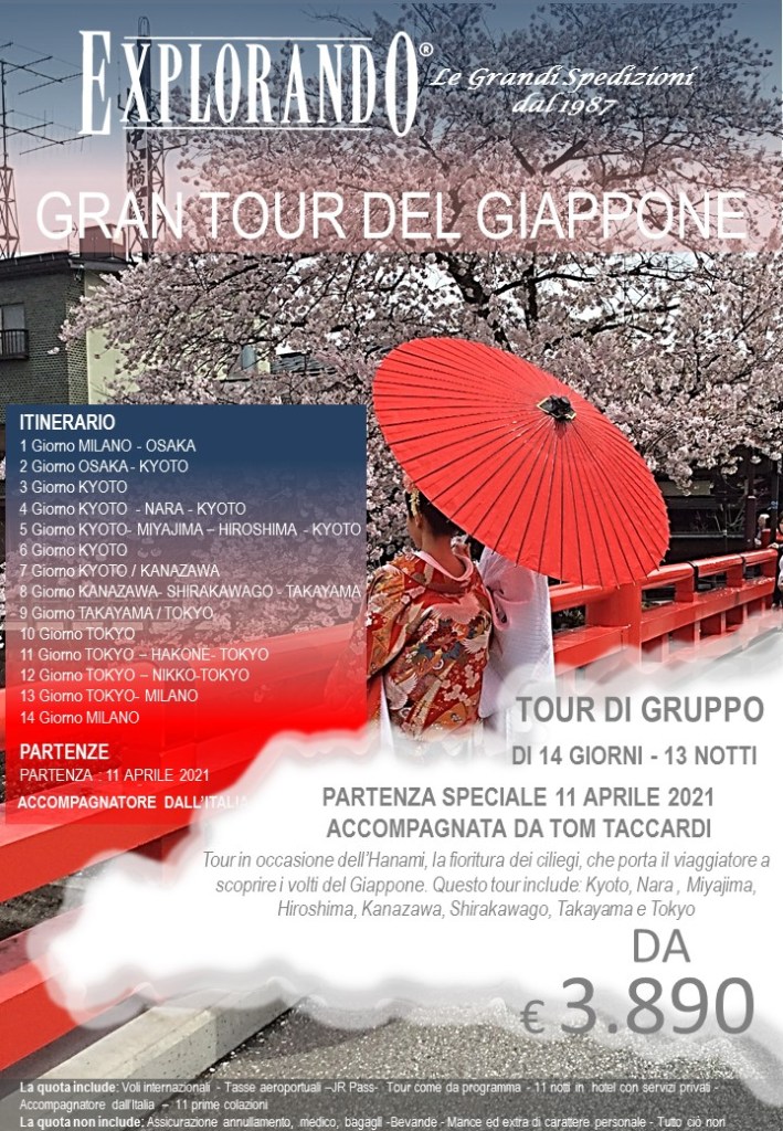 Gran Tour accompagnato da Tom Taccardi in occasione dell’Hanami, che porta il viaggiatore a scoprire i volti del Giappone. Dalle immense megalopoli ai centri minori carichi di fascino e di cultura, con delle tonalità che privilegiano sia gli aspetti tipici, tradizionali di questo paese sia le note piu‘ moderne e contemporanee; quindi si passa dall‘iper-tecnologica Tokyo all‘antica capitale Kyoto, dalla natura del lago Ashi al parco naturale di Nara. la zona di Shirakawago, con i caratteristici villaggi e case triangolari dal tetto di paglia. Il Giappone dei Samurai con Kanazawa e Takayama, La splendida citta‘ di Nikko con i suoi tesori artistici e il suo parco naturale, , il tempio Kiyomizu a Kyoto, la citta‘ di Nara culla del buddismo.